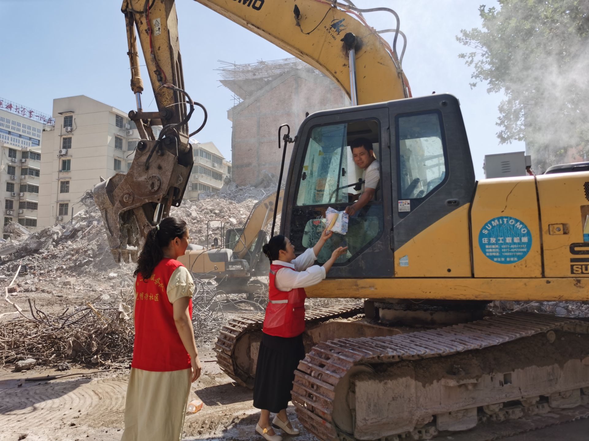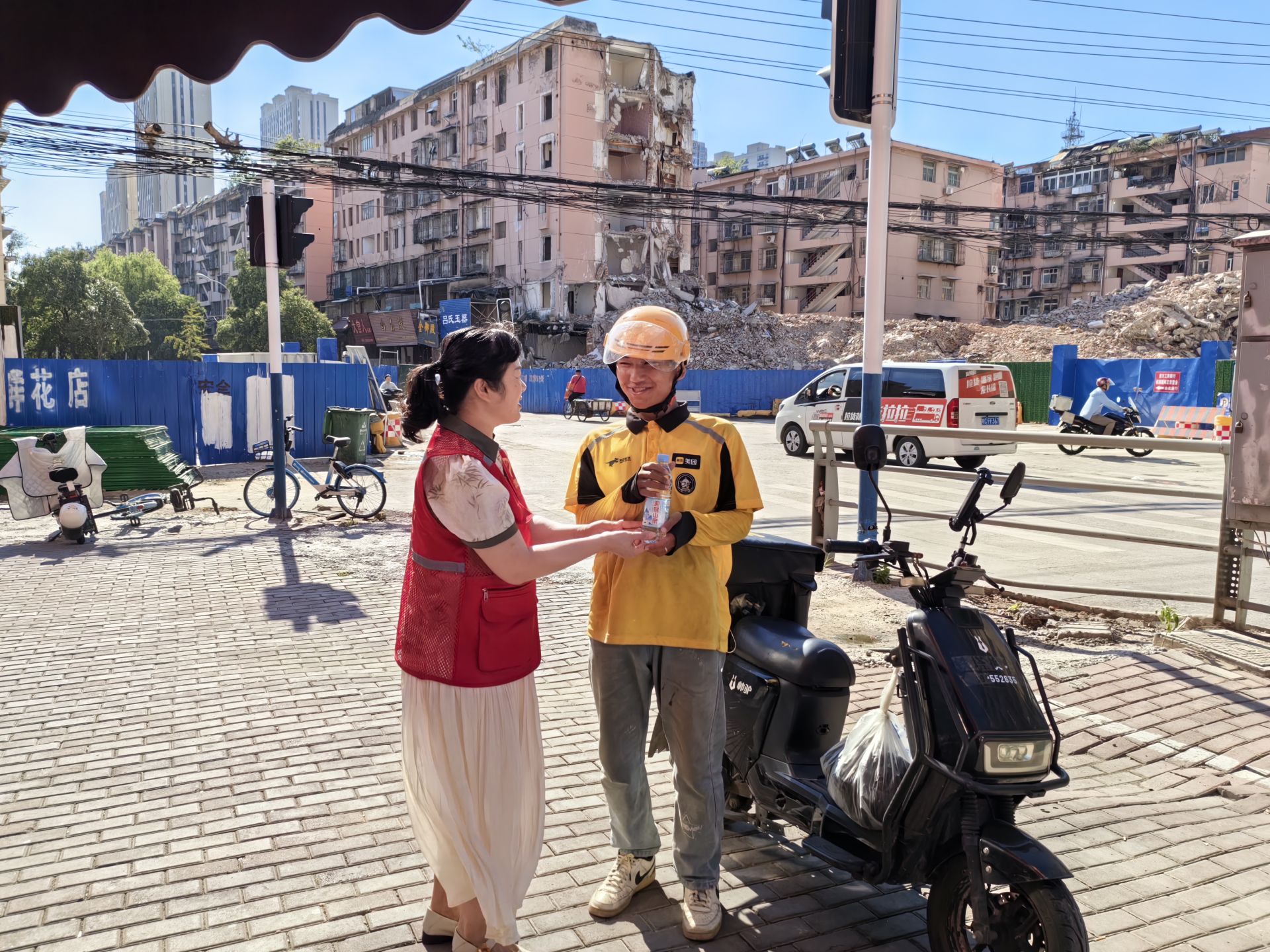 活动期间,治淮街道工会依托各社区工会驿站,提前备好清凉解暑的瓶装饮用水。工作人员化身“清凉使者”,主动走上街头、深入工地,将一瓶瓶满载着关怀的饮用水送到正在劳作的户外工作者手中,并反复叮嘱大家注意防暑降温、劳逸结合。这份突如其来的关怀让每一位接到水的劳动者脸上都露出了惊喜和感动的笑容。“这水送得太及时了!天热消耗大,正好解渴。谢谢你们总是想着我们!”一位刚收到水的外卖小哥由衷地说道。
