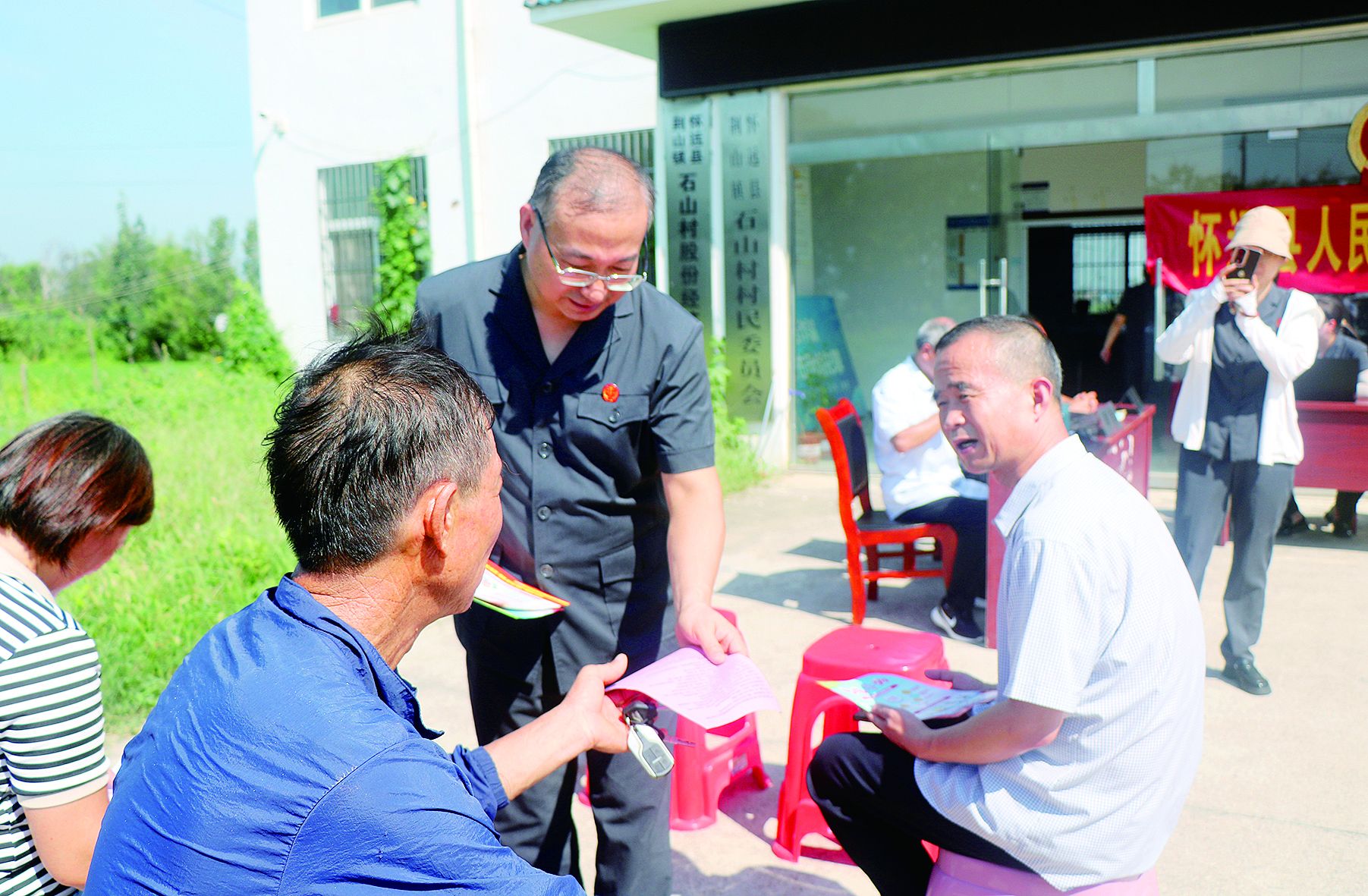 近日,怀远县人民法院干警在巡回审判间隙向村民发放宣传资料,耐心讲解移风易俗相关知识,引导村民摒弃陈规陋习,以法治宣传助力乡村文化建设,推动文明乡风、良好家风、淳朴民风的形成。刘流 摄 【编辑:于英利】 0