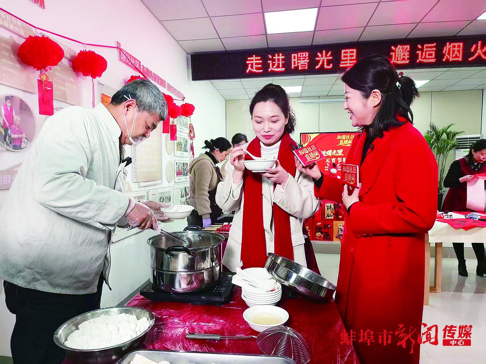 3月3日,农历正月十五,上午10点,蚌埠市龙子湖区东升街道曙光社区新时代文明实践站张灯结彩、笑语盈盈,全省首个和谐社区直播间以“走进曙光里·邂逅烟火气”为主题的元宵节特别活动正在这里温情上演。40分钟的直播吸引了线上6万余名观众,直播间氛围热烈,许多网友通过点赞、留言的方式积极参与互动,共同欣赏了这场线上盛会。