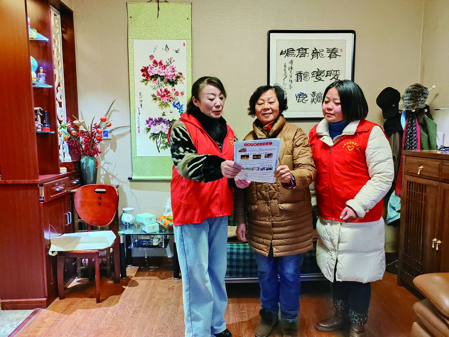近日,秦集镇文竹苑社区印制冬季防火安全等宣传单,组织社区志愿者深入居民家中辅导宣传,告诫居民“出门不忘三件事,熄火断电关燃气”。图为志愿者在君临天下小区居民家中宣传。 汪广毛 摄 【编辑:贾铁成】 52