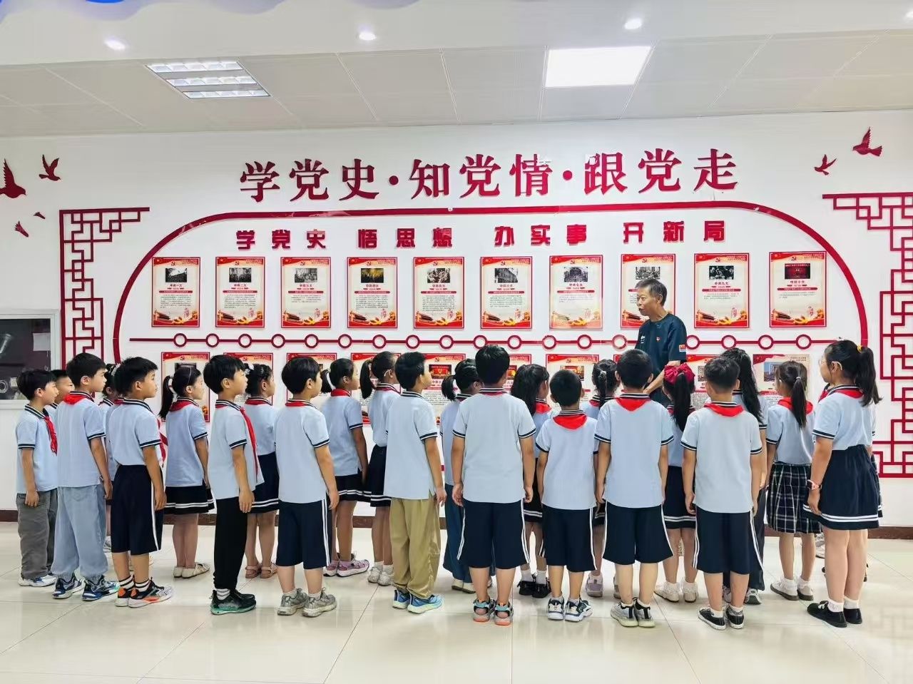 文竹苑社区红色党史学习教育长廊里,黄旭彬作为老兵宣讲团成员,以生动形象的党史故事为切入点,带领孩子们通过一张张照片了解党史中的重大事件、重大成就和典型人物、动人故事。通过沉浸式的党史、党情参观学习,孩子们更加深刻地认识到胸前红领巾的意义,纷纷表示要努力成为能够担当民族复兴大任的时代新人。