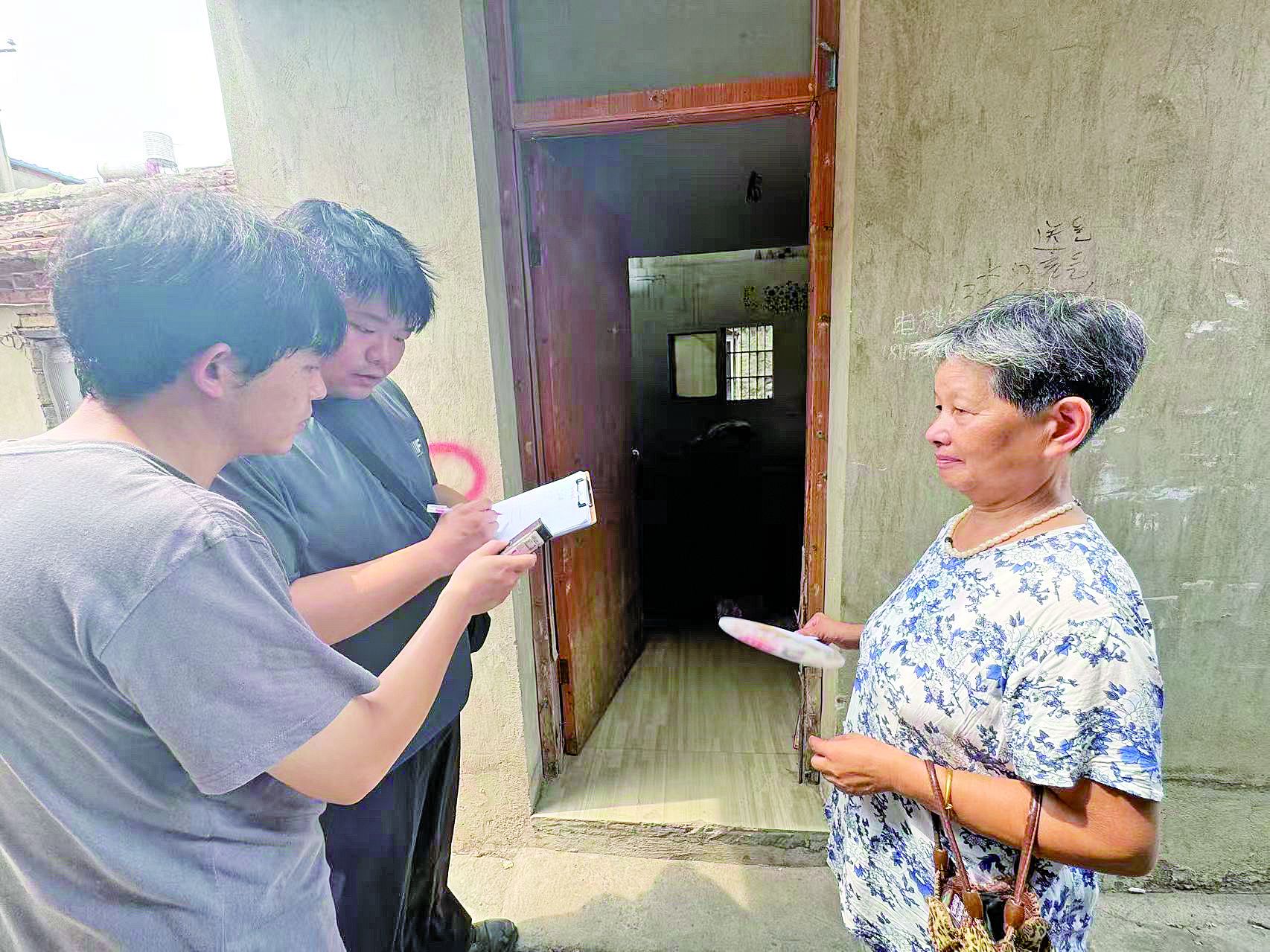 工作人员上门登记丈量危房