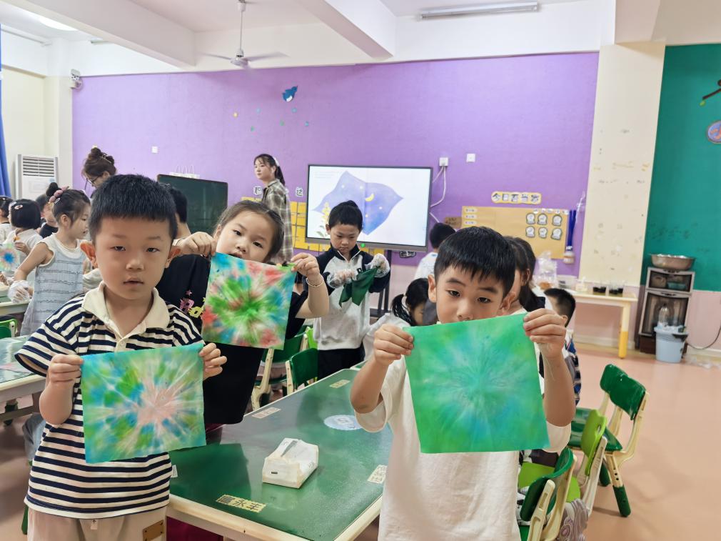 最令人惊叹的时刻到来了!当孩子们将手帕染后展开的那一刻。看着原本白色的布料在颜色浸染过程中发生的变化,孩子们不禁发出阵阵惊呼。活动现场弥漫着探索与发现的喜悦氛围,孩子们举着自己创作的蜡染手帕,脸上洋溢着自豪的笑容。