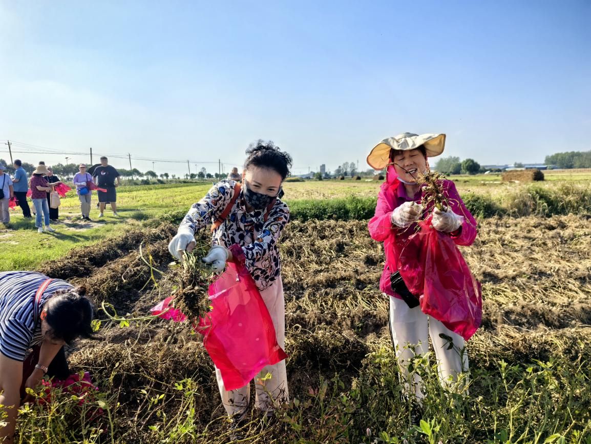 午后时分,游客们转场至王庄镇东南村,亲身体验花生采摘的农耕乐趣。连绵的花生田绿浪翻滚,游客们弯腰采摘、现场剥壳、品尝鲜果,尽情感受“泥娃娃变金豆豆”的丰收喜悦。活动现场欢声笑语不绝于耳,不少游客感慨,亲手劳作不仅唤醒了童年记忆,更让他们深切体会到“国家地理标志产品——王庄花生”的独特价值。