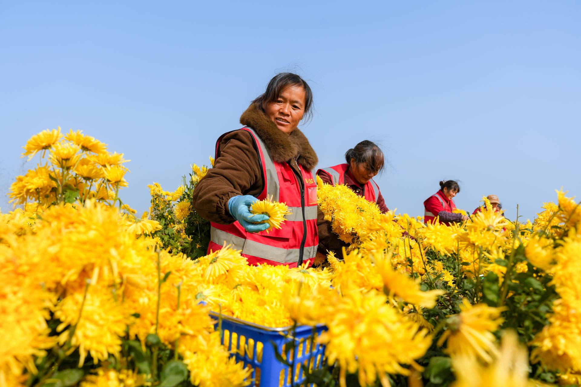 初冬时节,在蚌埠市固镇县垓下景区的菊花种植基地,一簇簇菊花拔蕊怒放,工人们穿梭在花海中忙着采摘、分拣成熟的菊花,运到烘干车间进行深加工。
