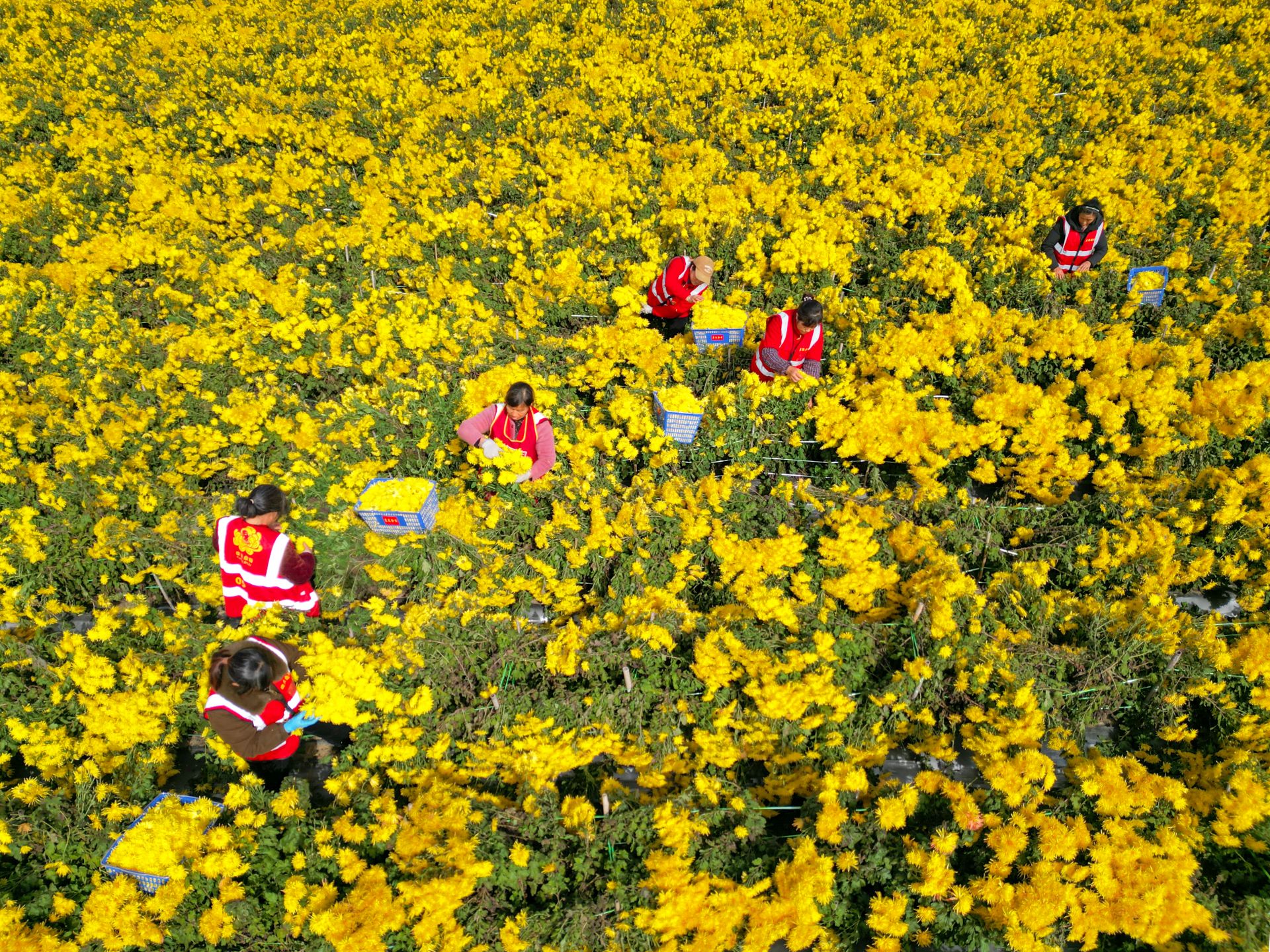菊花产业为经济发展作出积极贡献的同时,也为当地村民铺设了“致富路”。“一天能摘100多斤,每天能收入八九十块钱呢。”采摘工王芳边说边熟练地采摘。菊花不仅扮靓了乡村田野,还绽放出“美丽经济”,带动当地群众实现“家门口”增收。记者了解到,固镇县的菊花产业带动了60余名长期工就业,采花期可以吸纳用工300人,人均增收4000元左右。