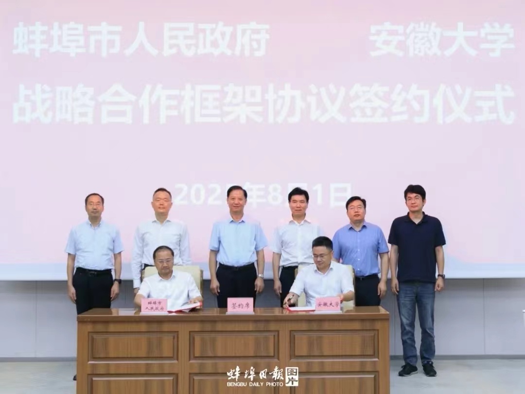 在安徽大学,黄晓武、马军一行深入强光磁大科学装置、集成电路研究院、光电信息全国重点实验室等处,认真了解安大科技创新、产教融合、成果转化等情况,就进一步深化校地合作进行交流对接。在随后举行的签约活动上,黄晓武向安徽大学创新发展取得的成绩表示热烈祝贺,向安大一直以来对蚌埠发展的关心支持表示衷心感谢。他说,近年来,蚌埠坚持创新驱动、招商带动“两动并进”,大力发展六大新兴主导产业和六大产业集群,塑造了经济发展新动能新优势,与安大有着广阔合作前景。希望双方以此次签约为契机,在科技创新、产业发展、文旅融合等方面开展全方位合作,携手实现优势互补、互利共赢。虞宝桃表示,蚌埠文化底蕴深厚、工业基础扎实、科教资源丰富、产业前景广阔、经济活力迸发,安大将充分发挥自身作用,把学科专业优势和蚌埠产业优势相结合,不断拓宽合作领域,加快推进合作项目,更好参与、支撑和服务蚌埠经济社会发展。马军、孙长银分别介绍了蚌埠和安大发展情况。