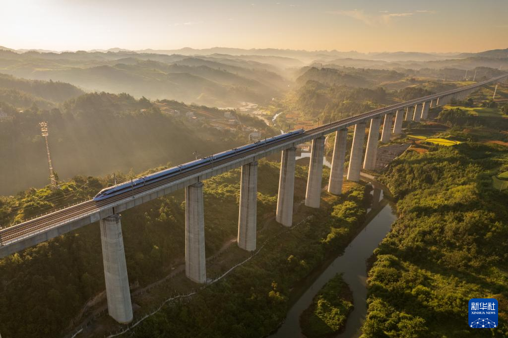 2023年8月31日,一列动车组在晨曦中经过位于贵州省独山县郊外的贵南高铁银坡河特大桥(无人机照片)。新华社记者 刘续 摄