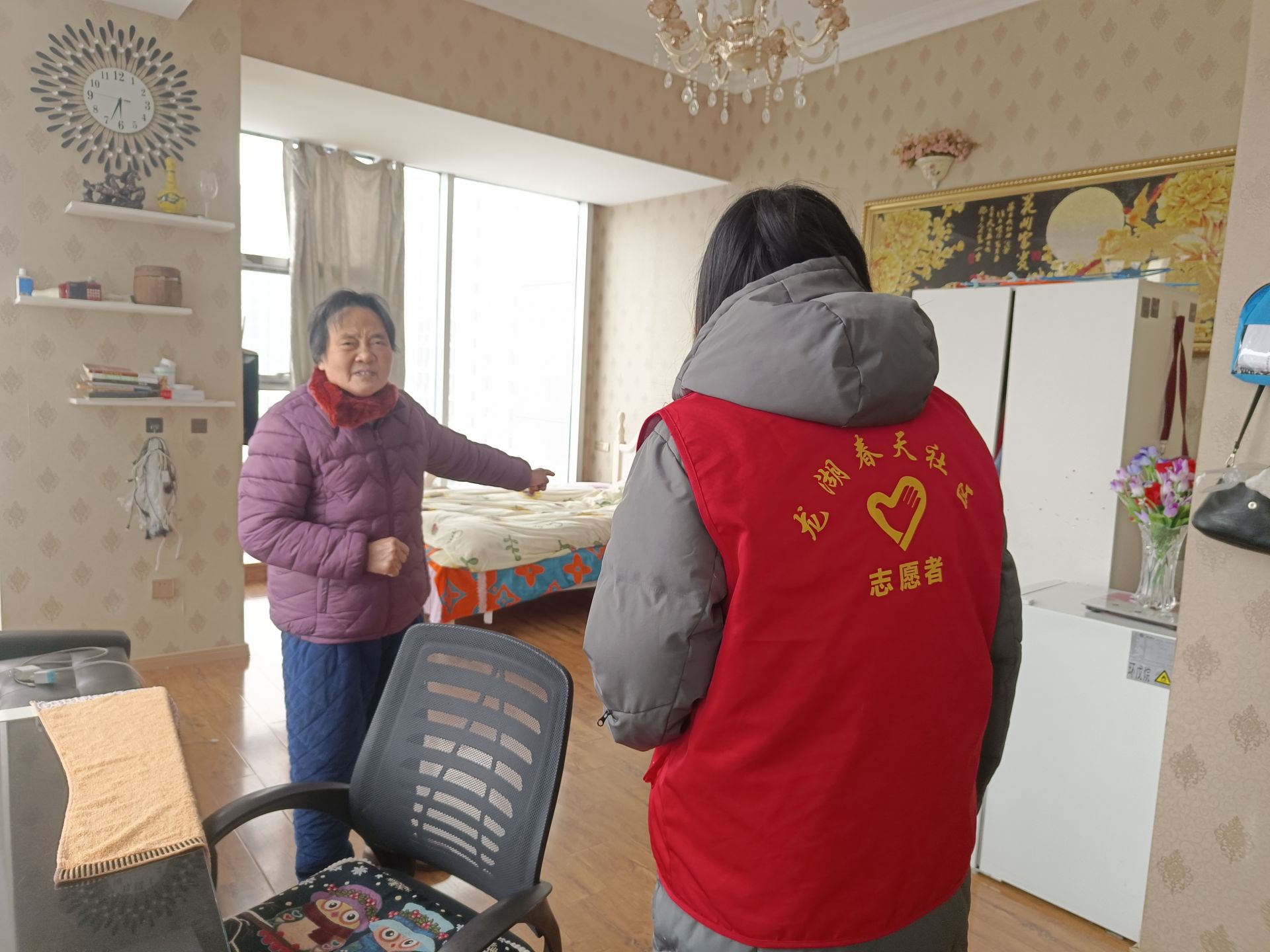 为进一步保障雪天独居老人居家安全、传递社区温情,在清雪任务告一段落后,志愿者们兵分多路开展上门探望行动。每到一户,志愿者们都仔细检查老人家中水电暖气使用状况,反复叮嘱老人雪天尽量减少外出,同时告知老人有任何需求可随时联系社区,用暖心举措让独居老人在寒冷冬日感受到浓浓的关怀。