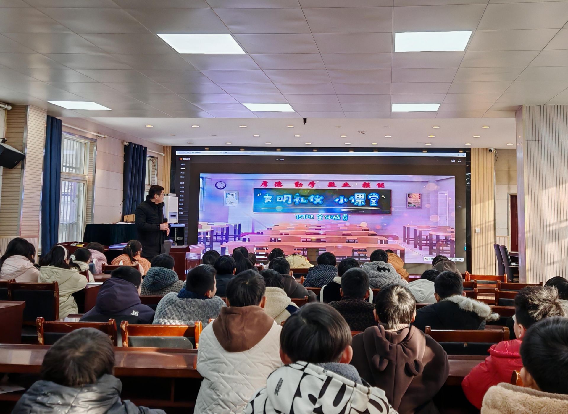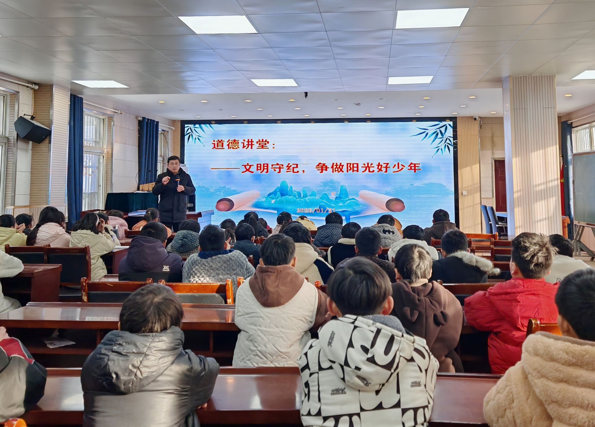 胡克强围绕“文明守纪”核心主题展开宣讲。他结合校园生活实例,阐释了文明礼仪在人际交往中的重要价值,强调纪律意识是成长成才的基石,引导学生将文明规范内化于心、外化于行,呼应了《中小学德育工作指南》中“德育为先、全面发展”的工作要求。