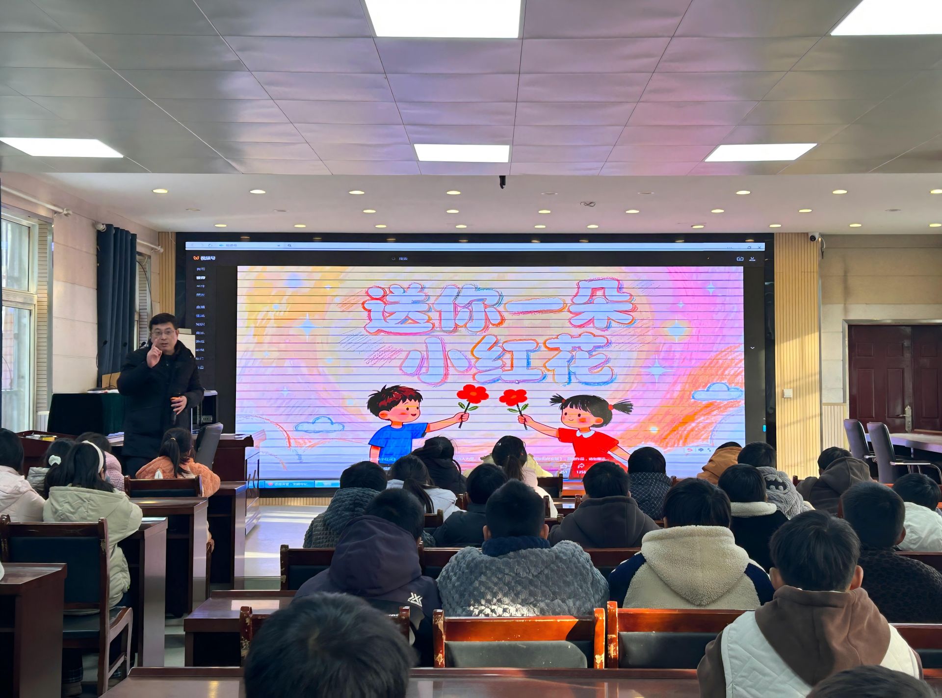 在学唱《送你一朵小红花》环节,温暖的旋律传递着积极向上的力量。这首歌曲所承载的对生活的热爱、对成长的鼓励,与活动主题深度契合,让学生在传唱中学会欣赏他人、肯定自我,感受德育教育的温度与力量。现场学生纷纷表示,要在日常生活中践行文明守纪行为,争做有担当的好少年。