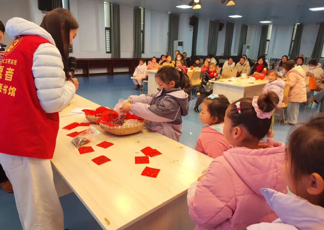 活动的核心环节是 “纳福”仪式。小读者们将各自从家中带来的米、豆、红枣等食材汇入“聚福盆”,亲手体验“小分享汇聚大福气”。大家又将这份混合好的“百家福”分装成小福袋,把集体的祝福带回家。