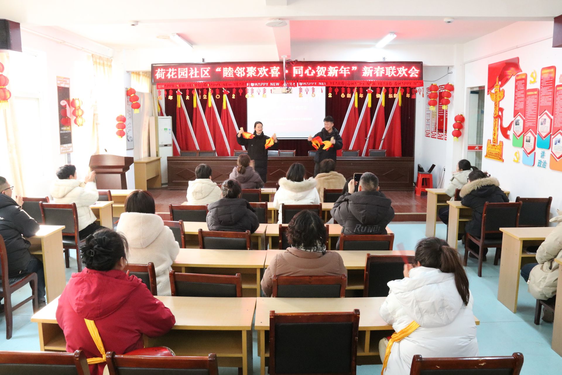 2月10日下午,荷花园社区开展了“睦邻聚欢喜·同心贺新年”新春联欢会。联欢会在热情洋溢的新春致辞中拉开帷幕。社区向全体居民致以诚挚的节日问候,并对大家一年来对社区工作的支持表示感谢在新的一年里身体健康、阖家幸福。