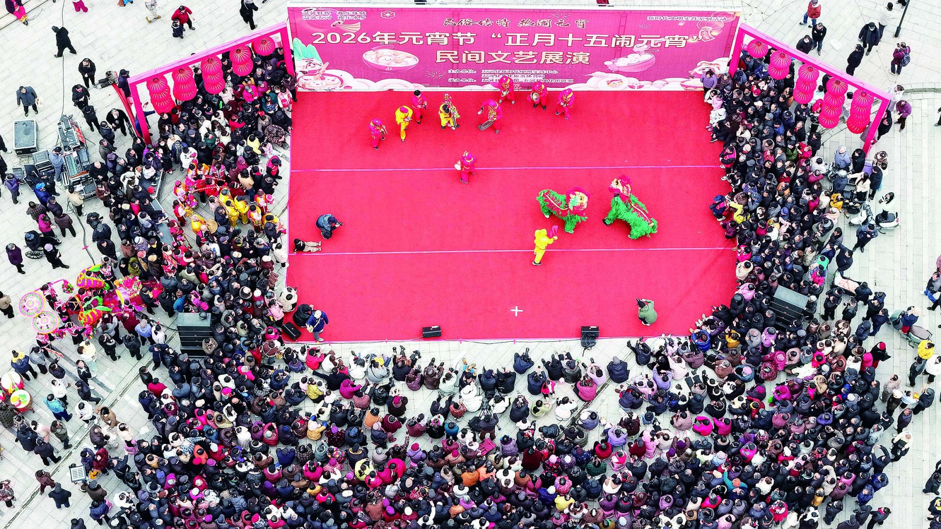 3月3日,五河县以“民俗传情 热闹元宵”为主题,在新时代文明实践中心广场举办民间文艺展演,10支队伍带来舞龙、耍狮、划旱船等非遗节目,搭配猜灯谜等互动,以广场展演与踩街形式闹元宵,尽显皖北水乡的民俗年味。 本次展演聚焦群众喜闻乐见的地方非遗,其中临北狮子舞作为五河代表性非遗,以扑、窜、跳、滚等高难度动作结合花鼓灯锣鼓伴奏,尽显淮河文化特色与人狮和谐的意境。李向前 摄