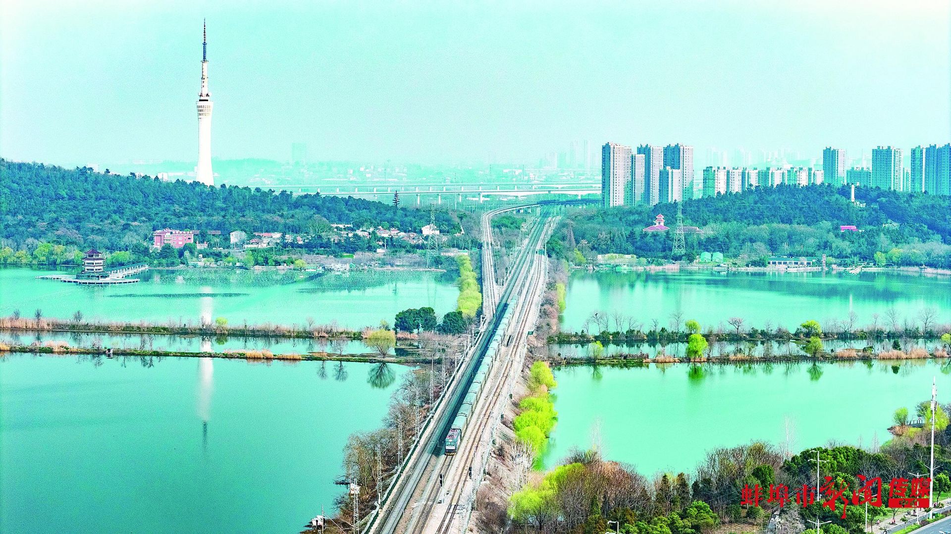 近日,龙子湖畔春意渐浓,碧水如镜映着岸边新绿。一列火车穿行于湖光山色间,远处城市楼宇错落有致,勾勒出一幅自然与城市交融的春日画卷。