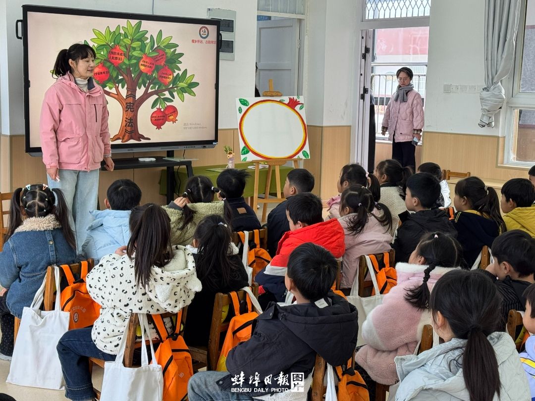 课间,教室外,孩子们在老师的带领下学习《学法守法中国娃》手势舞;教室里,童谣《中华民族一家亲》轻轻回荡。教师志愿者夏凯丽利用捐赠的绘本,为中班孩子带来了一堂别开生面的“宪法启蒙课”。她向孩子们抛出一个问题:“要是把宪法比作一样东西,你们觉得它像什么?”孩子们仰起小脸,眼睛亮晶晶的。很快,答案在老师手中呈现——宪法像一棵坚实的大树,而在怀远,它更像一棵石榴树,守护着像石榴籽一样紧紧抱在一起的56个民族。