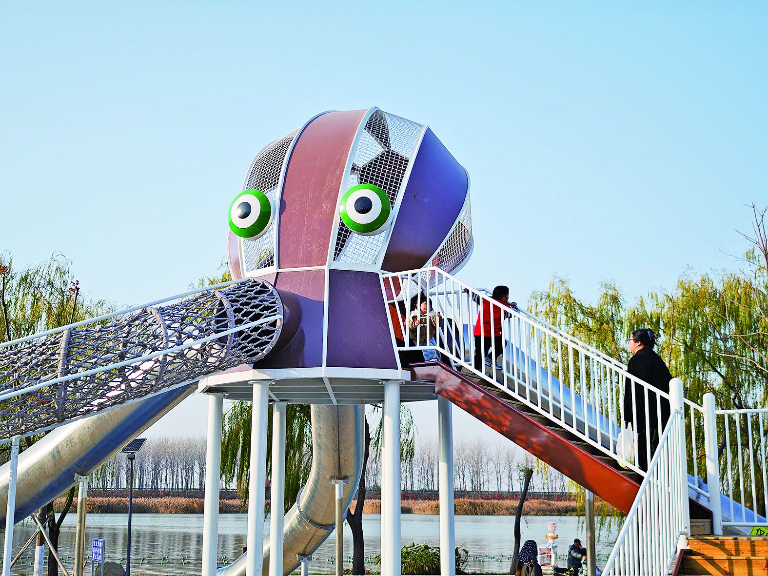 初冬时节,五河县滨河公园里,阳光穿透榉树与海棠的枝叶,在绿道上洒下光影。孩子们在透明滑梯上嬉戏,老人们沿石阶漫步,宁静而惬意。